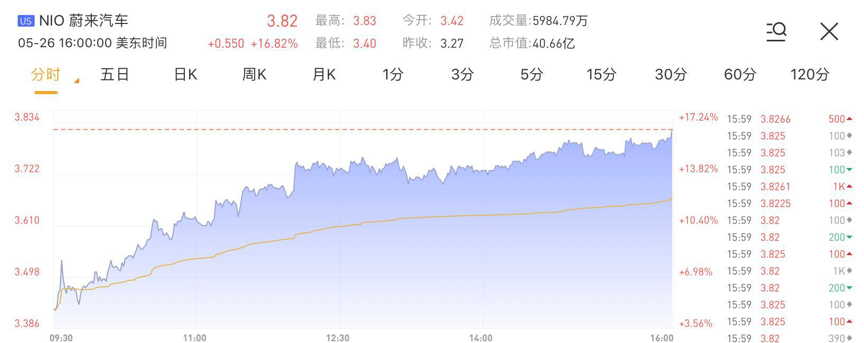 在财报发布前夕,蔚来股价也迎来一波大涨。截至5月26日收盘,蔚来大涨16.82%,报3.82美元每股,当前总市值重回40亿美元上方。