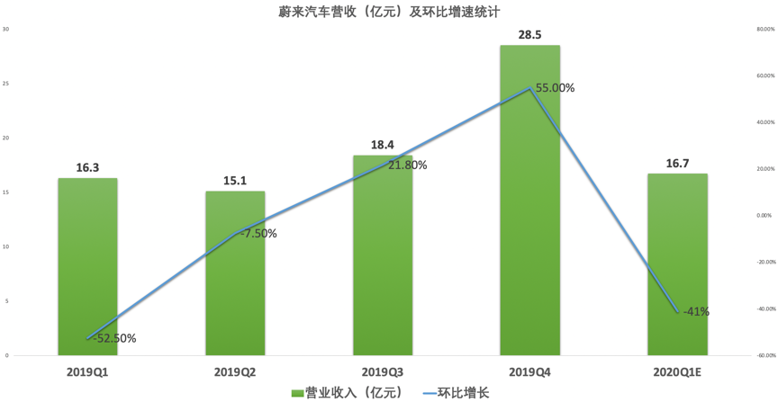 从营收角度看,蔚来在过去一年实现递进式增长,并在Q4创下28.5亿元的营收峰值。推动营收上涨的主要是新车型ES6的销售放量。此外,对于2020年一季度,分析师一致预期为16.7亿元,环比4季度下滑41%。