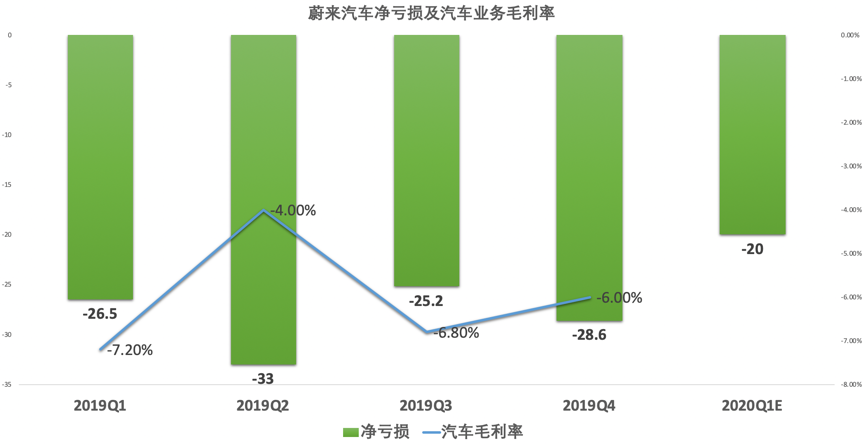 净亏损相比于营收,并没有同步扩大。尤其是Q4,在营收大幅增长的同时,亏损较前三个季度并没有显著放大,而较其中的二季度更是显著缩小。对于2020Q1,分析师一致预期为亏损20亿元,亏损继续缩窄。不过,单就整车毛利率来看,整体有所改善,但程度有限。到Q4仍维持负毛利,意味着卖一辆亏一辆,而且亏的越来越多。