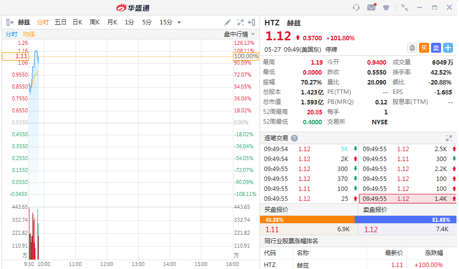 美国租车巨头赫兹股价暴涨101.8%,报1.12美元,此前因价格波动而暂停交易。