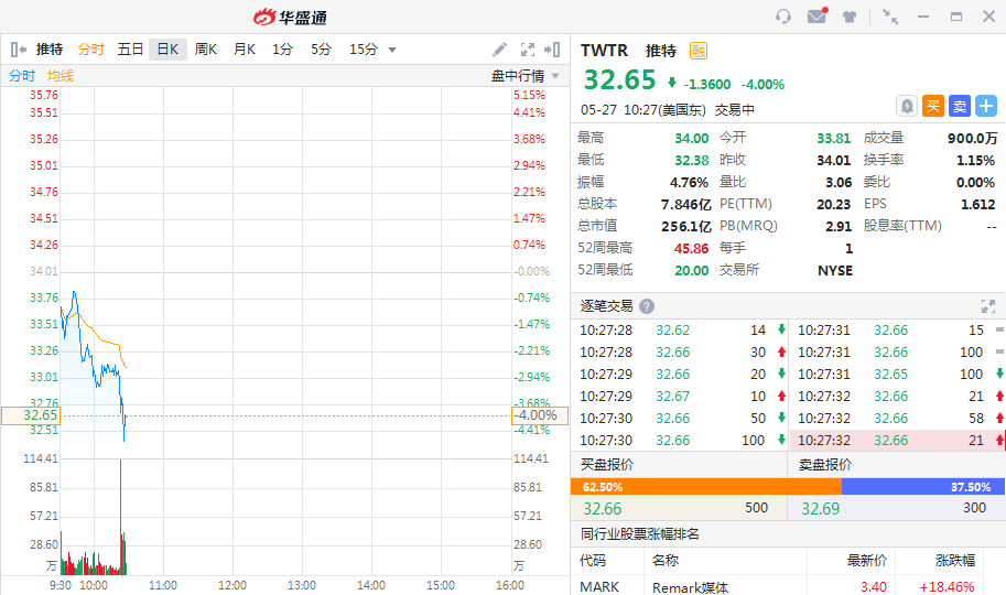 今日早盘,推特股价低开后跌幅扩大,截至发稿,跌近4%,现报32.65美元。