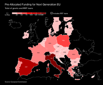 在7500亿欧元一揽子计划中,5000亿欧元将以无需偿还的救助款形式分配给欧盟成员国,2500亿欧元用于放贷。为了给该计划提供资金,欧盟将在金融市场上借款至多7500亿欧元。