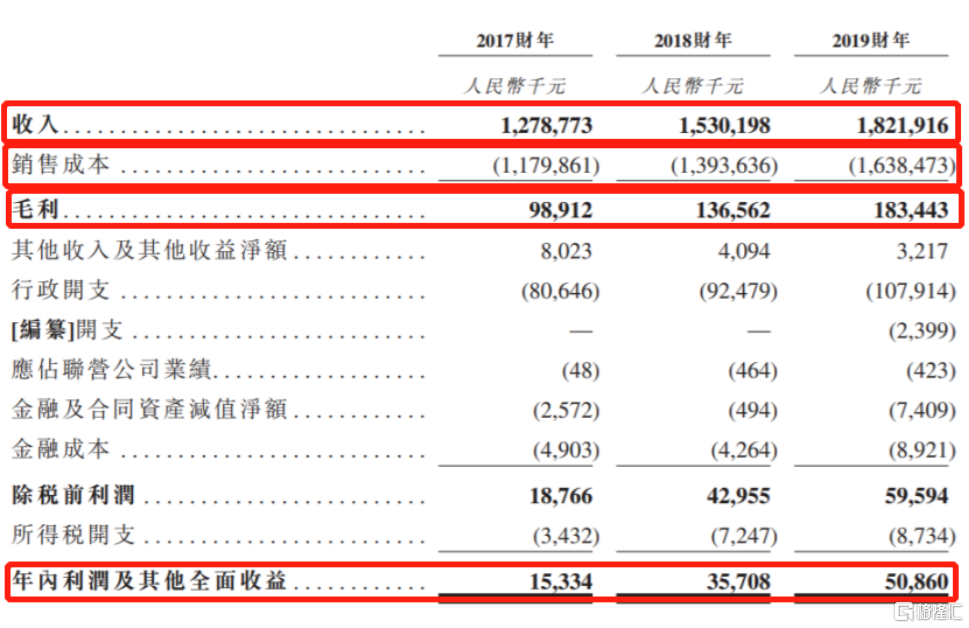 财务资料方面,截至2019年12月31日止三个年度,总收入分别为约人民币12.79亿元、人民币15.3亿元及人民币18.21亿元;年内利润及其他全面收益分别为约人民币1533万元、人民币3571万元及人民币5086万元。
