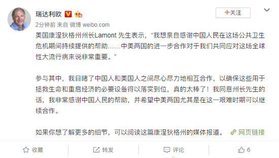 5月28日上午消息,瑞·达利欧是世界知名投资家,企业家,桥水基金创始人瑞·达利欧(Ray Dalio)在微博中称,美国康涅狄格州州长Lamont 先生表示,“我想亲自感谢中国人民在这场公共卫生危机期间持续提供的帮助……中美两国的进一步合作对于我们共同应对这场全球性大流行病来说非常重要。”