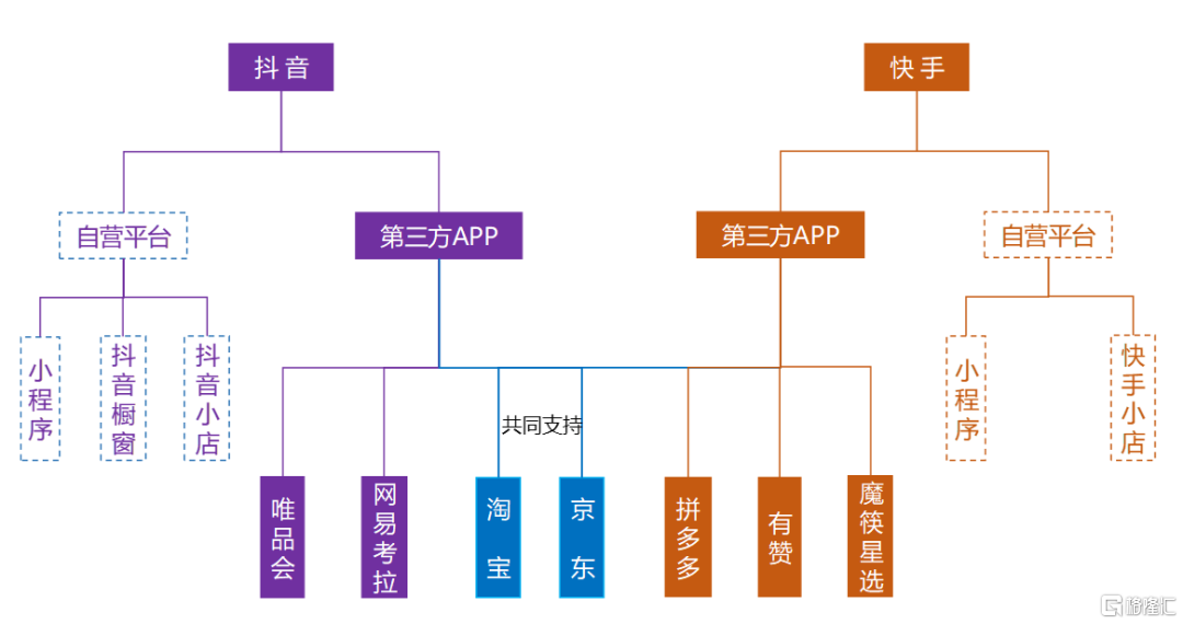 在行业早期,短视频平台的引流并没有明确的划分,主播既可以通过抖音和快手将购买途径引流到淘宝、京东、拼多多、唯品会等平台上,也可以直接在抖音小店和快手自营平台上完成转化。