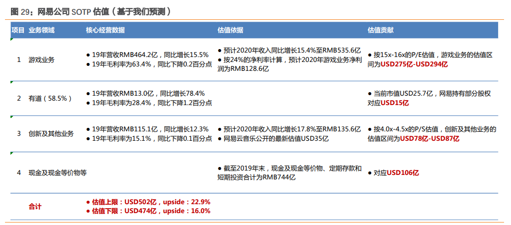 关于网易的合理估值,天风证券认为网易游戏精品化与长线运营优势突出,海外成为增长驱动力,未来产品线丰富;云音乐作为基于年轻圈层和原创音乐人的社区具备长期价值,且商业化价值逐步体现;有道受益在线教育快速发展及技术优势,有望成为中长期重要增长点;结合公司每 ADS现金$82 以及 20%-30%的分红率,看好网易公司的长期投资价值。基于 SOTP 估值法,网易的合理估值范围为 USD474 亿-USD502 亿,较当前市值存在较大的上涨空间,并给予了买入评级。