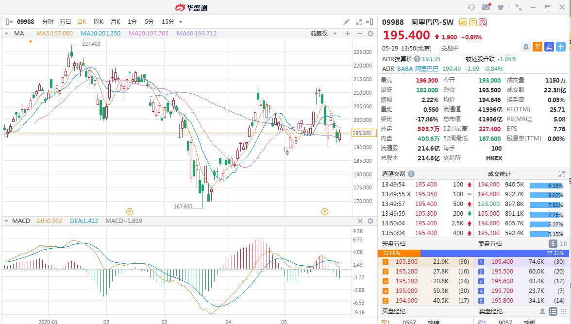 阿里当日开盘报每股187港元,较176港元的发售价上涨约6.25%;午盘收报每股188.10港元,较发售价涨6.88%,香港股市收盘,首日上市交易的阿里巴巴股价报收187.6港元,较发行价上涨6.59%。