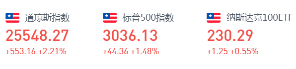 截至收盘,道指涨553.20点,涨幅2.21%,报25548.27点;标普500指数涨44.40点,涨幅1.48%,报3036.13点;纳指涨72.10点,涨幅0.77%,报9412.36点。