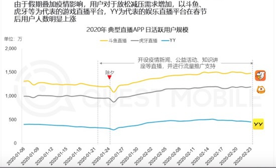 QuestMobile数据显示,疫情发生以来,每个网民每天花在移动互联网的时长比年初增加了21.5%,对于视频类应用增长尤为突出。假期叠加疫情影响,斗鱼、虎牙、YY等直播平台春节后用户明显上涨。