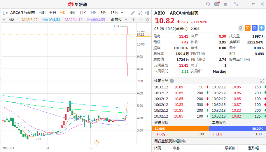 据悉,ARCA生物医药在美国东部时间5月28日10:17:18一度停牌,停牌原因为:涨跌幅波动异常交易暂停。