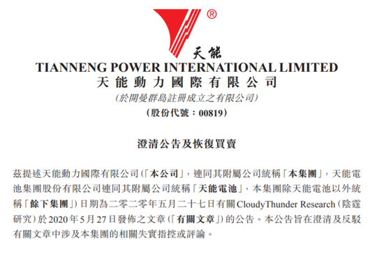 港股天能动力发布澄清公告称,有关文章声称本公司返利具有类似庞氏骗局的特徵纯属不负责任的主观臆测。本公司不存在少计经销商返利的情形,本公司完全具备返利支付能力,按照既定的返利政策计提返利并进行结算,实际发放返利金额与计提金额匹配,本公司返利政策完全不存在所谓的庞氏骗局情形。本公司已向联交所申请于2020年5月29日下午一时正恢复买卖本公司股份。