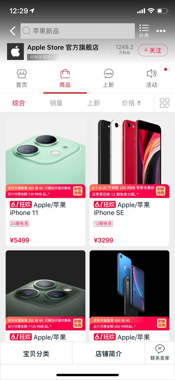 同日,苹果天猫官方旗舰店部分产品出现“618抢购”标识。阿里巴巴方面表示,这是苹果第一次以官方形式参与天猫618折扣活动,苹果天猫官方旗舰店iPhone11等全线产品支持跨店满减(每满300减40)及提供150元会场优惠券,相当于全场8折起。其中也包括4月刚刚发布的最新苹果手机iPhone SE,苹果官方出资降价200元,并支持12期分期免息。