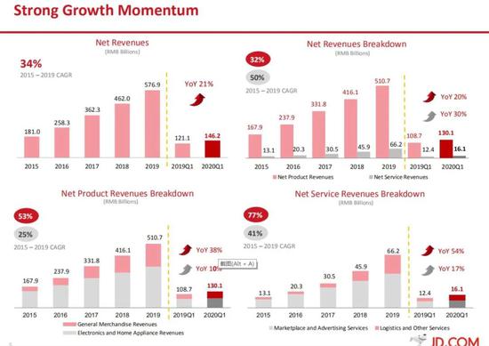 京东一季度总营收达1462亿元,同比增长20.7%。其中产品销售收入达1301亿元,占总营收比例89%,服务收入达161亿元,占11%。