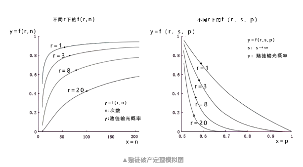 把不同r对应的f(r,n)和f(r,s,p)放到同一个图中进行比较,它形象地揭示了赌徒输光定理的含义:所谓的“公平”赌博,其实并不公平。