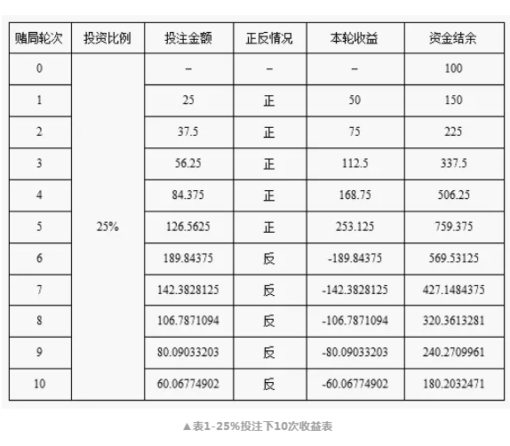 计算后每次下注比例为当时总资金的25%,这样就能获得最大收益。