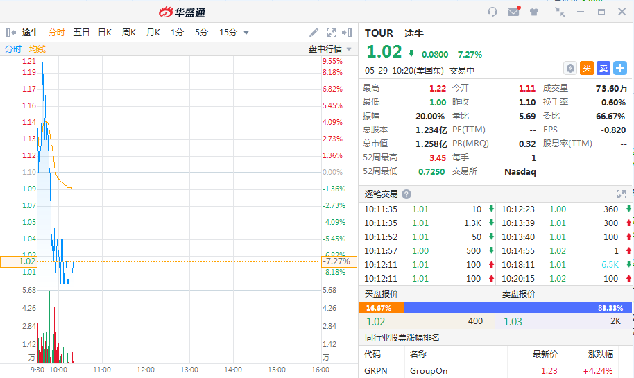 华盛资讯5月29日消息,途牛股价短线跳水,截至北京时间22:20,,跌超7%,此前盘初一度涨近10%。