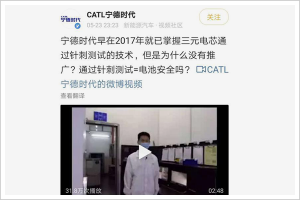 或许是作为对比亚迪的反击,宁德时代还在文中强调:“从技术上说,电池包层面有更优化的安全解决方案,单体电池针刺测试的实际需求已不复存在。”