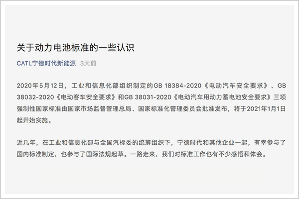 5月24日,宁德时代官方微信发布文章《关于动力电池标准的一些认识》,分享自己参与制定电动汽车及汽车电池强制性国家标准、国际标准的感悟,对当下主流技术、产品的看法。