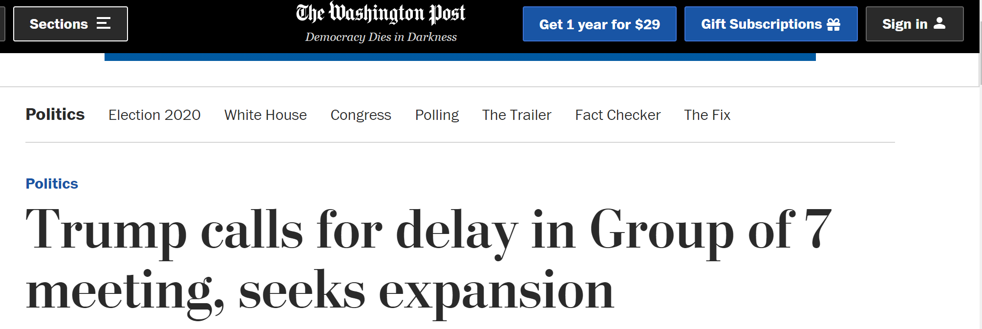 【环球网快讯】据美国《华盛顿邮报》刚刚消息,美国总统特朗普于30日提议,将把七国集团峰会(G7)的举办推迟到秋季,并呼吁扩大该集团的成员规模。报道称,特朗普表示,现存的集团已经“过时”, 不能恰当地代表当前世界正在发生的事情。