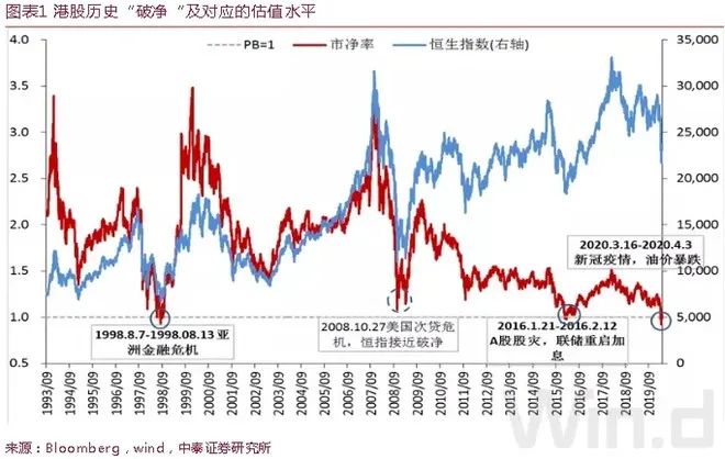 第一次,1998年因为受到亚洲金融危机的影响,港股持续的下跌,恒生指数第一次跌破市净率,低点达到0.93,指数估值创出了历史低点后,随后从最低点6544点(1998年8月14日)涨至18397点(2000年3月28日),涨幅高达163%。