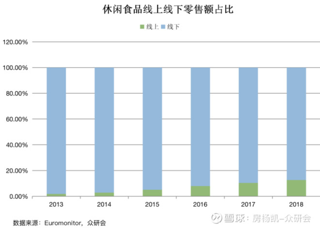 除门店之外,周黑鸭同时大力推进线上销售和外卖渠道,截至2018年底数据,周黑鸭已在22各电商平台进行线上销售和90个城市上线外卖业务。2019年,线上销售额占总销售额的11.2%,外卖销售额占自营门店总销售额的14.7%,同比增长5.6%。从天猫旗舰店的粉丝数据来看,周黑鸭的最多,达到了378万,绝味粉丝数第二,有66万,煌上煌的最少,只有31.7万。近年来电商快速发展,但休闲食品的线上销售占比只有12.5%左右,从市场容量来看,线上销售这一块的发展空间还是很大。