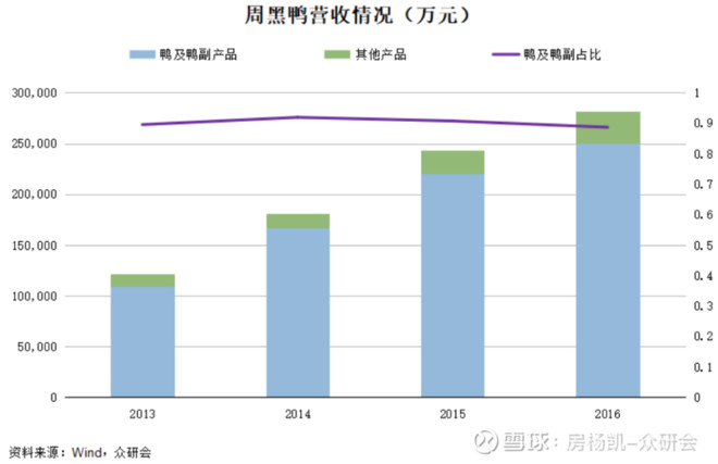 周黑鸭的主营业务以卤鸭及鸭副产品为主,配有红肉、蔬菜、其它禽类和水产的卤制产品主营业务收入占总收入的99%以上,公司业务条线清晰。根据公司的统计口径不同,我们目前只看得到公司上市之前的鸭及鸭副产品收入占比情况,可以看到是相对稳定在90%的水平,可以认为公司的业务结构相对稳定。