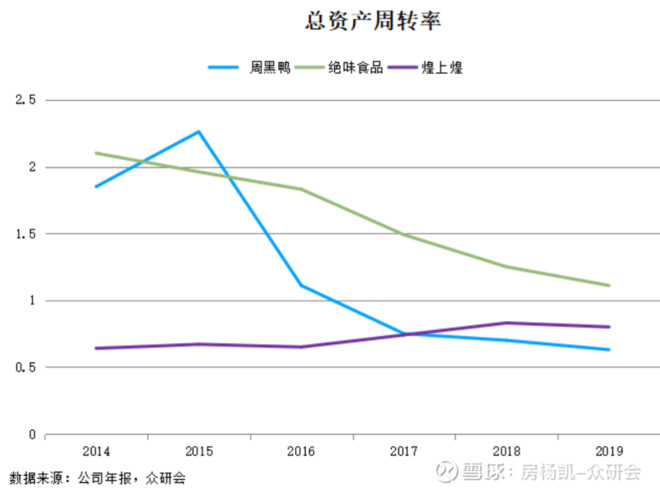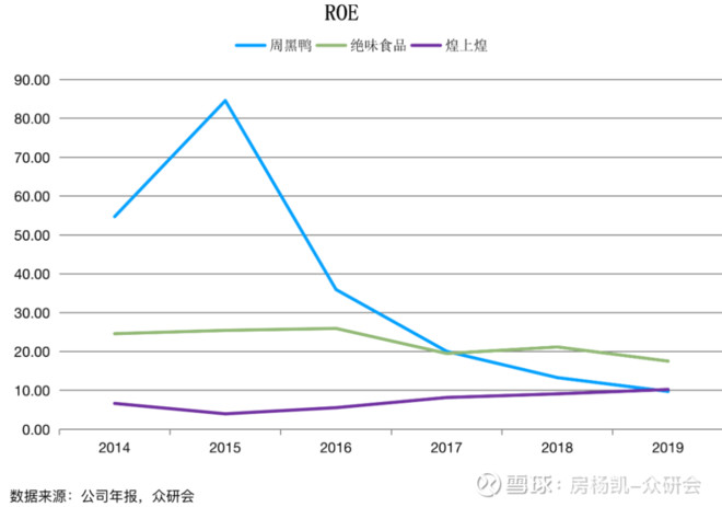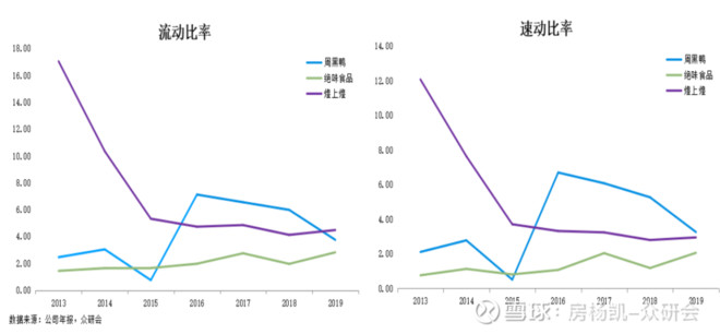 周黑鸭的ROE 相比绝味食品和煌上煌的ROE来看波动较大,2016年的骤降综合杜邦分析来看是由于2016年末上市后流动资产增加,但营收并未有太大变化而导致的总资产周转率大幅下降,从而使得ROE与2015年相比有了较大幅度的变化。而2017年以后的ROE下降则是由于销售净利率的持续下降引起的。