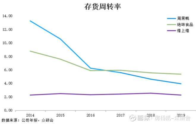 从营运能力来看,周黑鸭的存货周转率也曾处于较高的水平,但随着原材料价格的不断上涨,直营模式又要承担所有的原材料购买,周黑鸭从2016年开始每年都会在价格较低时预先储存原材料,从而导致了存货周转率的不断下降。