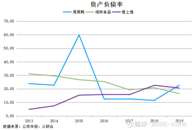 从偿债能力来看,无论是经营性现金流与流动负债的比例还是流动比率和速动比率,周黑鸭的短期偿债能力也还是处在上位区的,2015年的突然下降也是由于武汉工厂二期项目导致的流动负债大量上涨。而2017年的下降则是由于营收问题导致的。此处我们可以思考一个问题,周黑鸭的偿债能力的表现到底是由于公司经营情况良好还是由于上市融资所致?