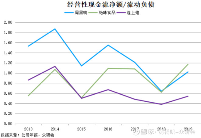 周黑鸭的资产负债率总体来看是处于相对偏低的水平,说明其杠杆较小,自有资金充足。但同时也是因为周黑鸭坚持的直营模式使得其资产相对较高。而2015年的波动则是由于其他应收款项中结构性存款减少以及兴建武汉工厂二期项目导致其他应付款大幅增加。2019年的突然上升则是由于2019年1月1日采用的香港财务报告准则第16号准则将租金确认为租赁负债所致。