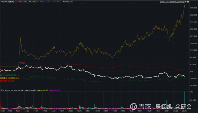 公司营收主要以自营门店为主,2019年,自营门店营收占总营收的86%以上,分区域来看,公司的大本营华中区域占比最重,2019年达到58%。此次新冠疫情期间,周黑鸭受到的影响也相对更重些,不论是主要生产区域还是主要销售区域均在疫情相对更为严重的省份。再加上交通枢纽人流量大幅减少,高势能区域门店的优势也消失殆尽,所以,在2020年的计划中,周黑鸭推出了社区团购的模式推进渠道下沉,在目前的社会环境中可以说是十分有效的新型营销方式。我们可以看一下自己的群聊,可以说相当一部分都是有自己小区里的水果或者蔬菜的团购群吧。(华中:湖北省、湖南省、河南省、江西省及安徽省;华南:广东省及福建省;华东:上海市、江苏省、浙江省;华北:北京市、天津市、河北省和山东省;华西:重庆市、四川省和陕西省。)