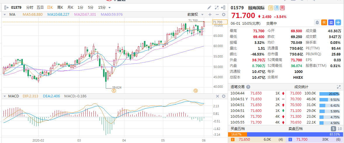 新浪港股讯,颐海国际(01579)升3.54%,报71.7元,创上市新高,最低价为69.4元,主动买盘93%;成交27.48万股,涉资1941.25万元.以现价计,该股暂连升2日,累计升幅7.21%