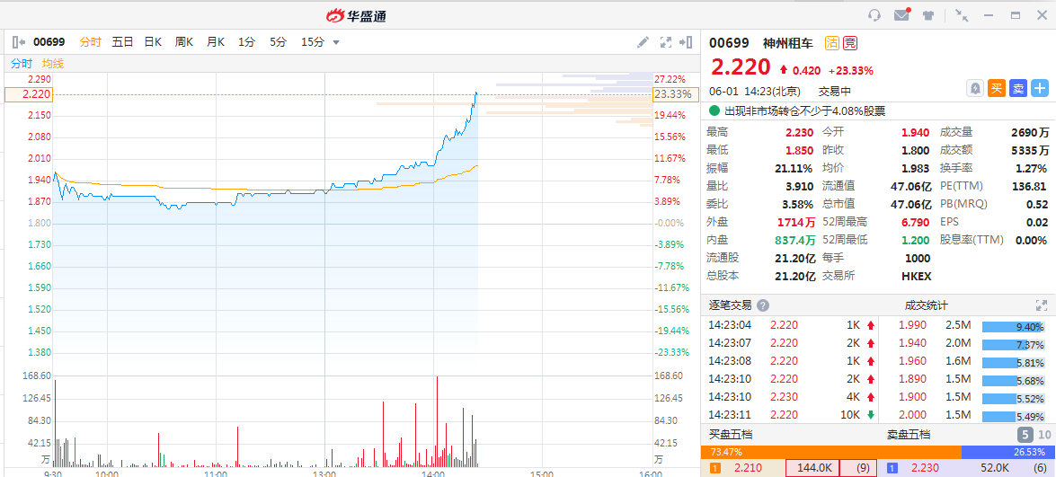 新浪港股讯 6月1日消息,北汽拟接盘神州租车,陆正耀将完全退出,神州租车涨幅扩大至20%。