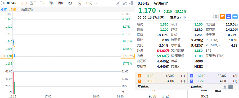 华盛资讯6月2日讯,海纳智能(01645-HK)暗盘低开20.29%,一手账面亏1120港元,截至16:16报价1.17港元,跌幅15.22%。最新成交额142万港元,总市值为5.428亿港元。