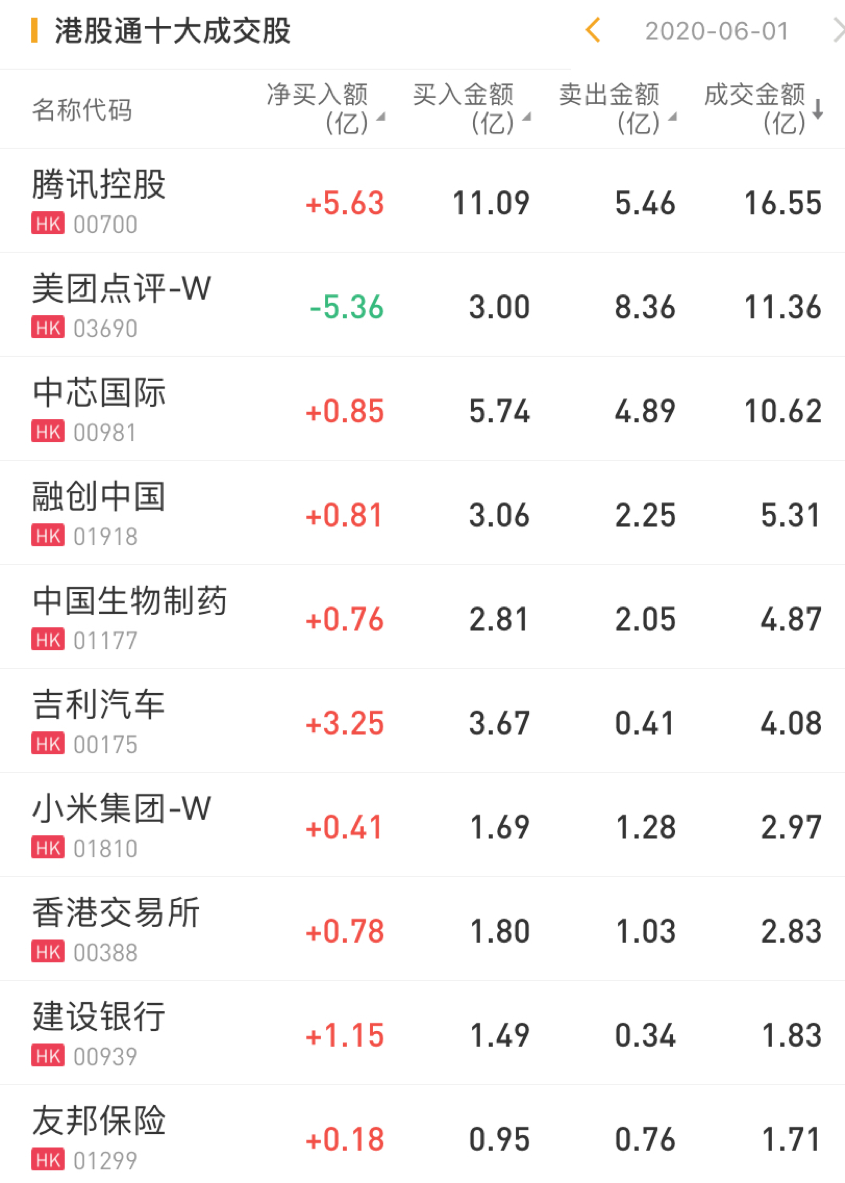 今日,南下资金净买入腾讯控股5.63亿港元,净买入吉利汽车3.25亿港元,净买入建设银行1.15亿港元,净买入中芯国际0.85亿港元。此外,南下资金今日净卖出美团点评5.36亿港元。