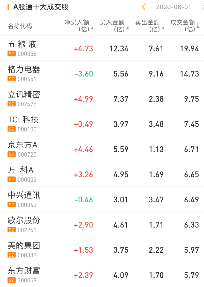 今日,北上资金净买入五粮液4.73亿元,净买入立讯精密4.99亿元,净买入京东方A4.46亿元,净买入万科A3.26亿元。