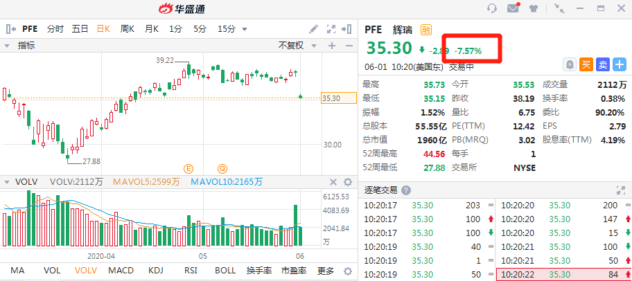 6月1日,美股医药巨头辉瑞股价大跌,截至发稿时间股价跌7.38%,报35.37美元,受此影响,另一家制药公司吉利德科学股价也重挫3.92%,报74.83美元。