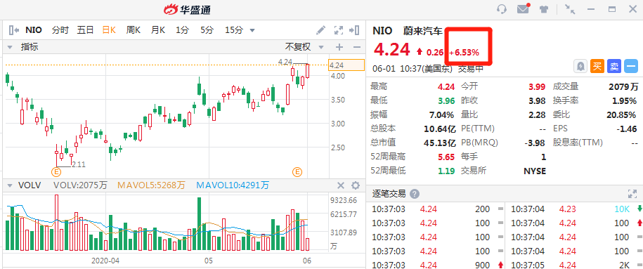 华盛资讯6月1日讯,美股盘初,蔚来(NIO)开盘后持续走强,截至北京时间22:37,该股涨幅扩大至6.53%,报4.24美元,总市值为45.13亿美元。
