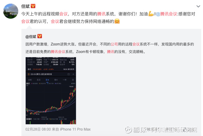 2020年2月28日,深圳东方港湾投资管理股份有限公司董事长但斌发布了一条微博,毫不吝惜对于腾讯会议的好评,并表达了自己的感谢。