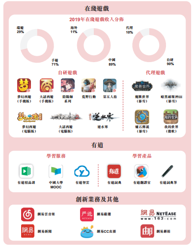 截止2019年底,网易已经提供超过超过140款手游和端游,涵盖各种类型游戏品类。在智能学习领域,网易有道平均月活跃用户数量超过1亿;而网易云音乐用户数超8亿,吸引超10万原创音乐人入驻(截至2020年4月数据,已突破16万人),这些原创音乐人的歌曲在2019年累计播放超过2700亿次。