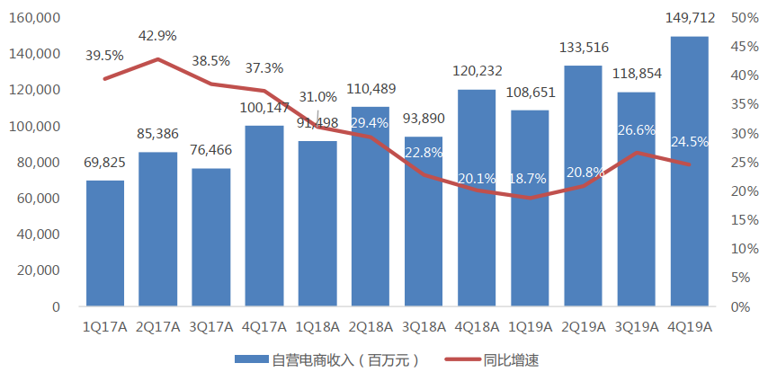 京东的财务状况也非常优秀,2019全年收入为5768.9亿元,同比增长24.9%。其中:自营电商业务收入为5107.3亿元,同比增长22.7%,服务与其他业务收入为 661.6亿元,同比增长44.1%。