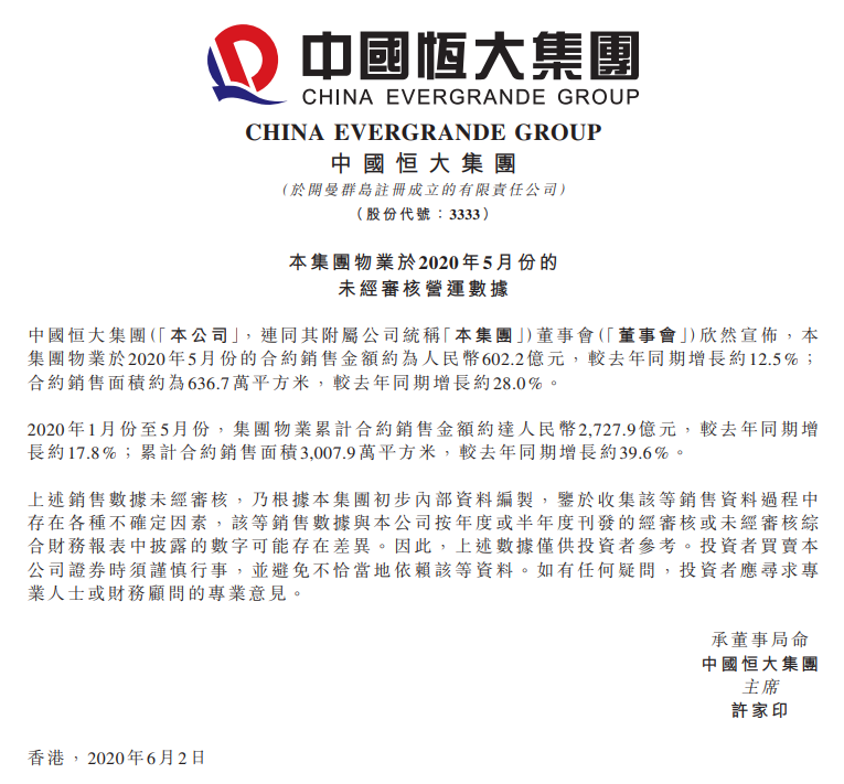 新浪港股讯 6月2日消息,中国恒大在港交所公告,本集团物业于2020年5月份的合约销售金额约为人民币602.2亿元,较去年同期增长约12.5%;合约销售面积约为636.7万平方米,较去年同期增长约28.0%。2020年1月份至5月份,集团物业累计合约销售金额约达人民币2,727.9亿元,较去年同期增长约17.8%;累计合约销售面积3,007.9万平方米,较去年同期增长约39.6%。