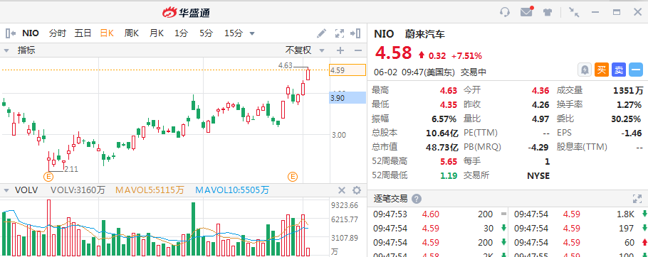 华盛资讯6月2日讯,美股开盘蔚来(NIO)涨超7%,截至发稿,蔚来汽车报价4.58美元,当前成交量1351万股,总市值为48.73亿美元。