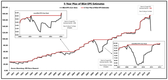 在2008年的衰退期,每股收益预期下降了42%,用了大约3.3年才缩小差距。