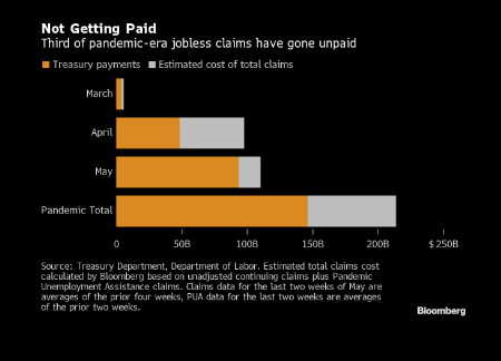 这个估计约670亿美元的缺口,显示出当局增加付款以及通过不断恶化的州系统进行付款的努力已经落后于失业危机所引发的需求。随着经济因疫情而关闭,有超过4000万美国人申请失业救济金。