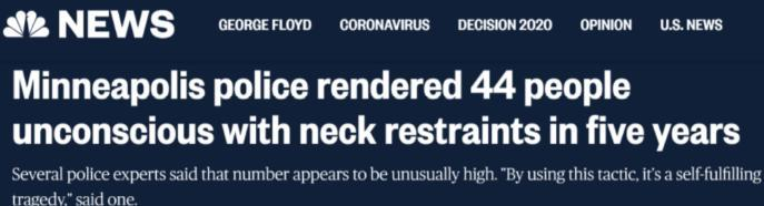 报道称,美国明尼阿波利斯警察局在过去5年的抓捕活动中至少使用了237次“颈部约束”,其中至少44次使被抓捕对象失去知觉。在大多数情况下,警方使用“颈部约束”的案件中没有明显的潜在暴力犯罪。