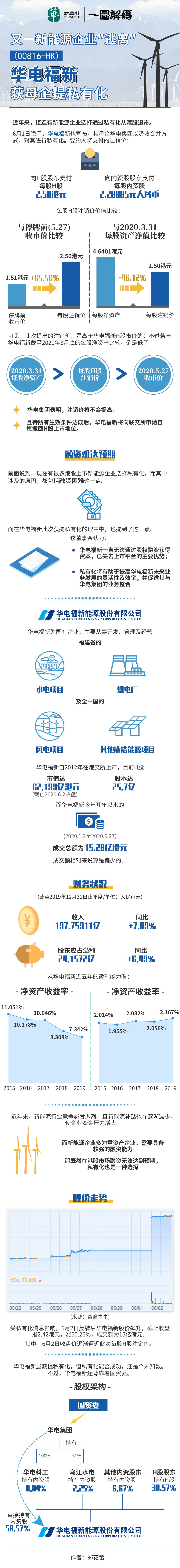 6月1日晚间,华电福新(00816-HK)公布,其母企华电集团以吸收合并方式,对其进行私有化。要约人将向H股股东支付每股H股2.50港元;向内资股股东支付每股内资股2.29995元人民币。若合并完成,华电福新将申请自愿撤回H股上市地位。华电福新于5月28日停牌,并于6月2日复牌后股价飙升,收涨60.26%,报2.42港元,成交额为15亿港元。