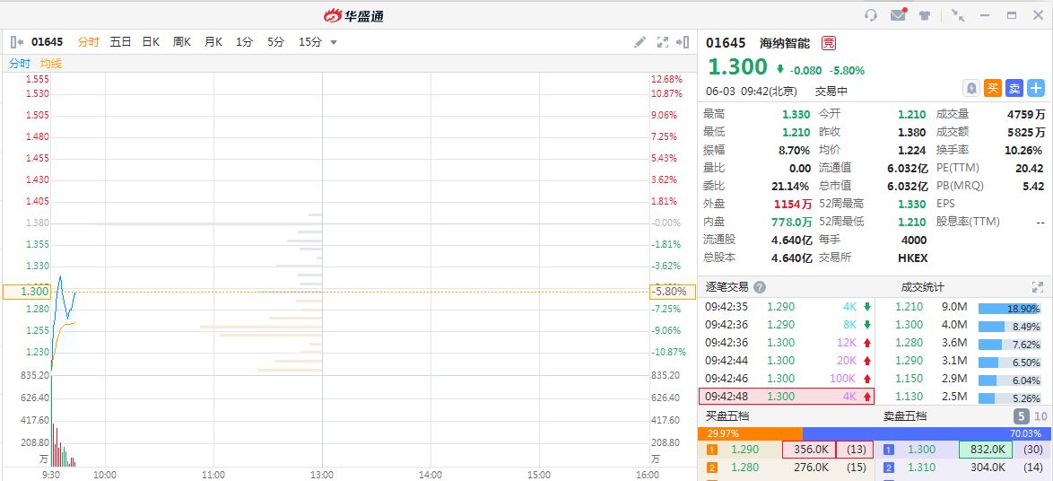 华盛资讯6月3日讯,海纳智能今日首挂低开12%,此后跌幅收窄至5.8%,海纳智能昨日暗盘收跌18.12%。