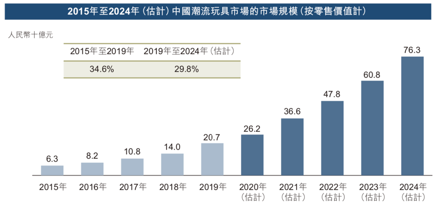 根据弗若斯特沙利文报告,中国潮流玩具零售的市场规模由2015年的人民币63亿元增加至2019年的人民币207亿元,复合年增长率为34.6%。受中国潮流玩具的受欢迎程度不断上升所推动,潮流玩具零售的市场规模预期于2024年将达人民币763亿元,自2019年起的复合年增长率为29.8%。