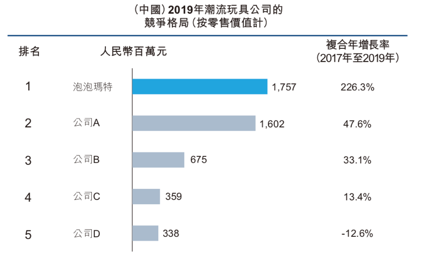 2019年,按零售价值计,前五大市场参与者在中国潮流玩具零售市场所占的市场份额分别为8.5%、7.7%、3.3%、1.7%及1.6%。按零售价值计,泡泡玛特是中国最大的潮流玩具品牌,市场份额为8.5%,并录得迅速增长。